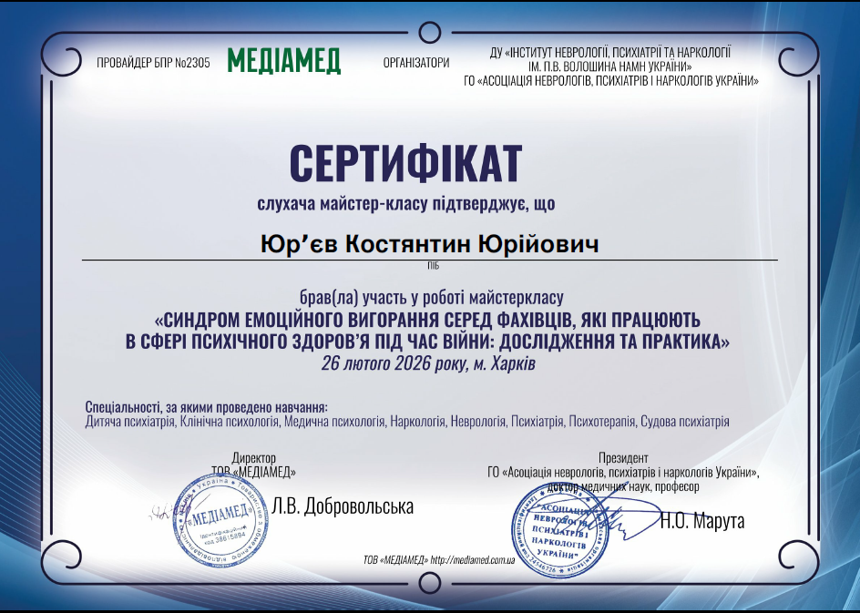 Спеціалізуюся на доказовій терапії (Evidence-Based Practice) за міжнародними клінічними протоколами. Поєдную академічну ґрунтовність із глибинною емпатією та навичками емоційної модуляції.